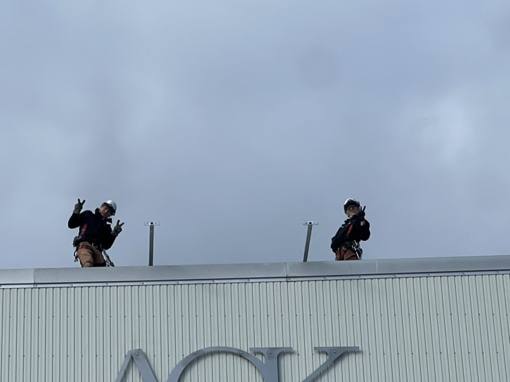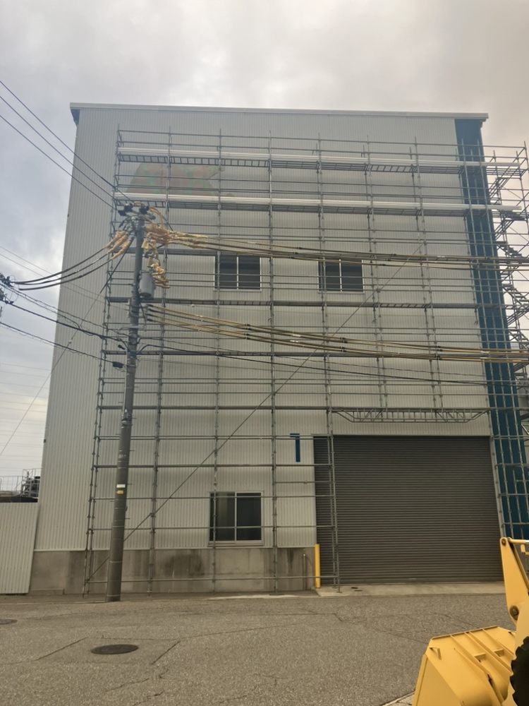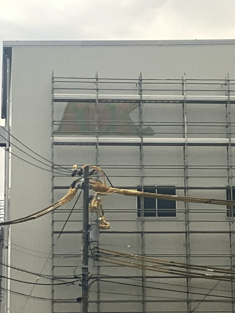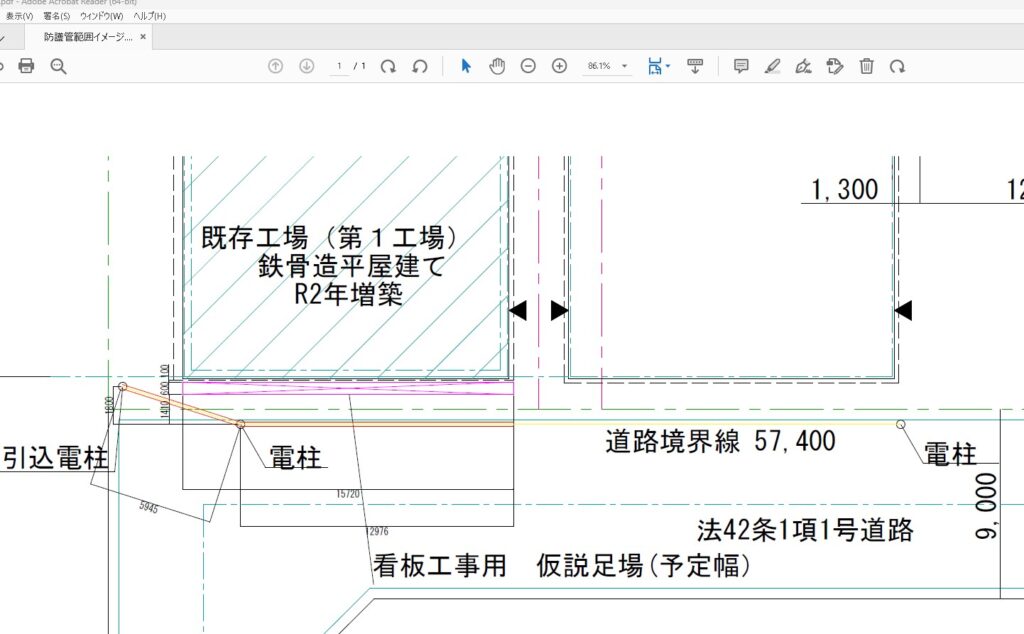 取付のために、防護管と足場の用意。ダンボールで実寸大の看板を作成して、最終の位置決め。